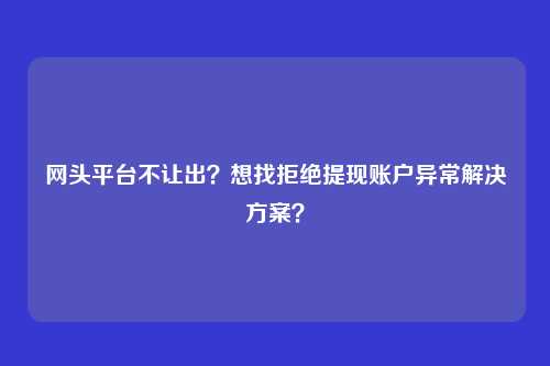 总之,出现出款不了的问题时,我们不要惊慌,要冷静分析问题所在,采取有效措施解决问题。同时,我们也应该在平时多加注意,保护好自己的账户信息,避免账户被盗用和损失。网头平台不让出?想找拒绝提现账户异常解决方案?