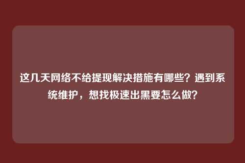 总之,出现不给提现的问题时,我们不要惊慌,要冷静分析问题所在,采取有效措施完美解决问题。同时,我们也应该在平时多加注意,保护好自己的账户信息,避免账户被盗用和损失。这几天网络不给提现解决措施有哪些?遇到系统维护,想找极速出黑要怎么做?